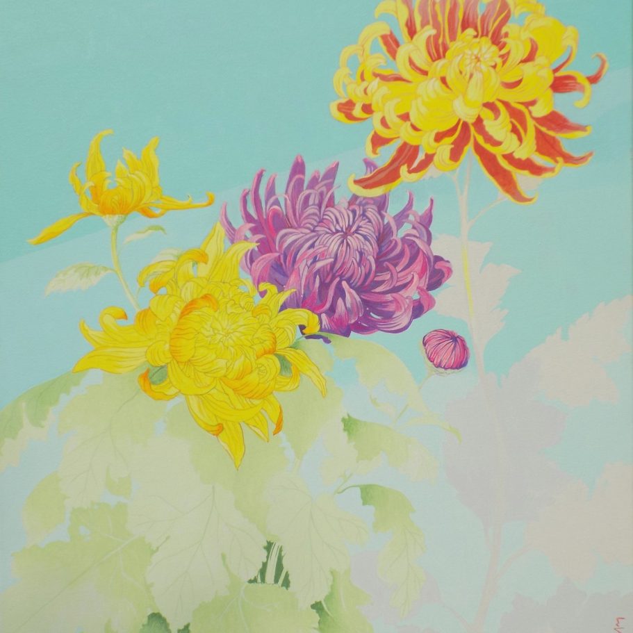 Autoportrait de l’exposition Fleurs du bien « Les fleurs en peinture n’ont pas de parfum, ce ne sont donc pas des fleurs, mais je construction géométrique, une composition, des couleurs qui sont des portes ouvertes sur nos espaces vibratoires intérieurs. Ces bouquets sont ainsi une sorte d’hologrammes vibratoire, dont l’interprétation est libre, le But étant que chacun soit ramené à lui-même, à son propre mode énergétique.La couleur est un mouvement, son alchimie rayonnante, la lumière blanche est l’élévation sublime, pas intellectuelle mais cellulaire, l’espace divin. La démarche est essentiellement psychique et complémentaire d’autres approches, car sa finalité est spirituelle. »